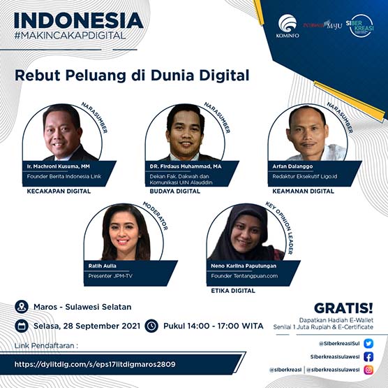Maros, Media-profesi.com – Rangkaian Program Literasi Digital “Indonesia Makin Cakap Digital” di Sulawesi, yang diselenggarakan oleh Kementerian Komunikasi dan Informatika Republik Indonesia dan Siberkreasi bersama Dyandra Promosindo, dilaksanakan secara virtual pada 28 September 2021 di Maros, Sulawesi Selatan.
