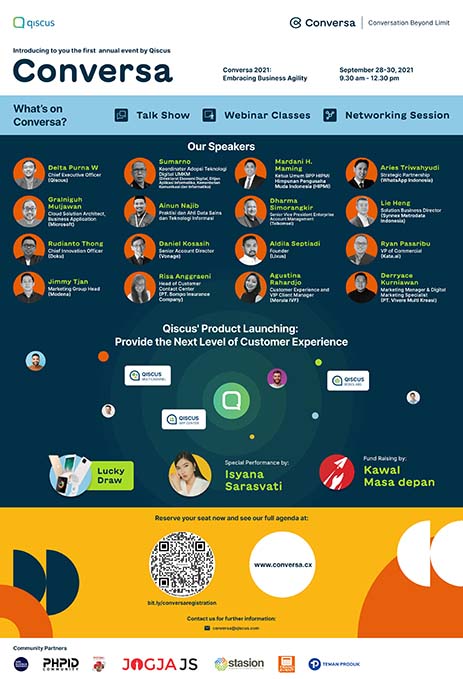 Jakarta, Media-profesi.com – Qiscus, perusahaan teknologi penyedia platform Multichannel Chat untuk bisnis, hari ini (28/9/2021) membuka rangkaian acara konferensi tahunan perdananya Conversa 2021 dengan tema “Embracing Business Agility”.