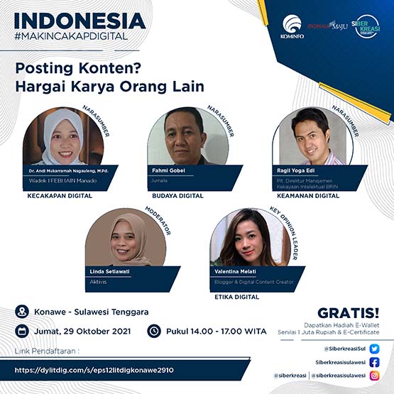 Konawe, Media-profesi.com – Rangkaian Program Literasi Digital “Indonesia Makin Cakap Digital” di Sulawesi, yang diselenggarakan oleh Kementerian Komunikasi dan Informatika Republik Indonesia dan Siberkreasi bersama Dyandra Promosindo, dilaksanakan secara virtual pada 29 Oktober 2021 di Konawe, Sulawesi Tenggara.