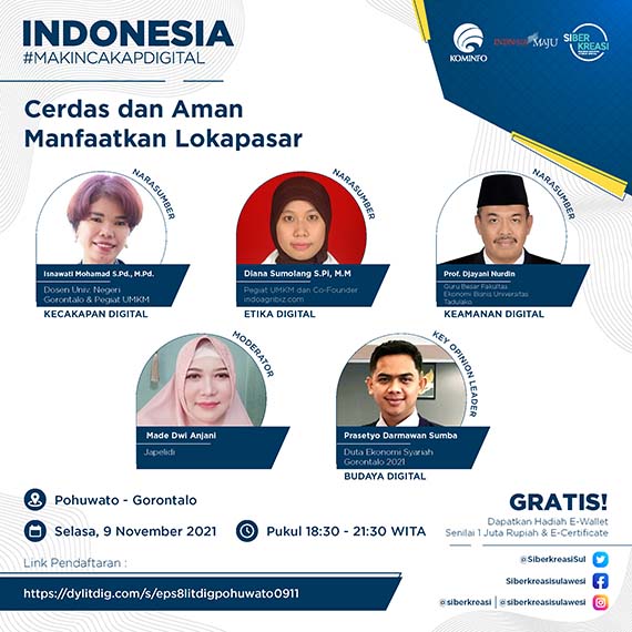 Kabupaten Pohuwato, Media-profesi.com – Rangkaian Program Literasi Digital “Indonesia Makin Cakap Digital” di Sulawesi, yang diselenggarakan oleh Kementerian Komunikasi dan Informatika Republik Indonesia dan Siberkreasi bersama Dyandra Promosindo, dilaksanakan secara virtual pada 9 November 2021 di Pohuwato, Provinsi Gorontalo.