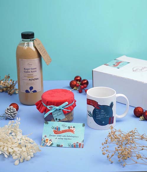 Kemudian, Noelle Hampers, paket yang cocok untuk penikmat minuman yang bisa menemani kesehariannya. Berisikan minuman 1 (satu) liter dan mug yang didesain spesial.