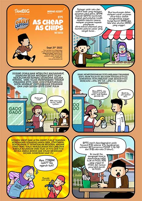 Kementerian Energi dan Sumber Daya Mineral mengatakan tarif listrik tidak akan naik pada Oktober. “Kami menegaskan kembali preferensi kami untuk BTPS karena menurut kami pemulihan dalam pertumbuhan laba bersihnya dan ROE seharusnya membuat BTPS layak untuk diperdagangkan lebih tinggi dari valuasi saat ini sebesar 2.7x FY22 P/B (-1.6SD dari P/B rata-rata 3 tahun),” papar Hariyanto.
