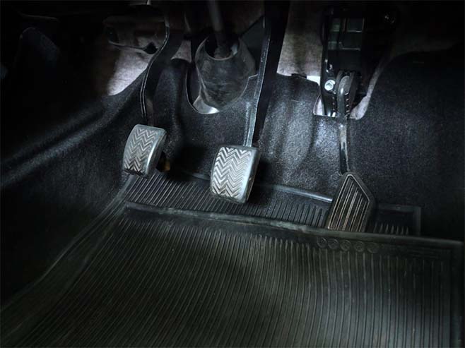 Periksa apakah tersedia landasan karet pada bagian kaki, khususnya pengemudi supaya tidak mudah selip sehingga mengganggu pergerakan kaki dan tidak cepat rusak karena tergesek sepatu.