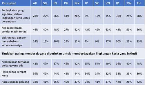 Menurut data, Jepang dan Korea Selatan merupakan negara yang kurang melihat perbaikan di lingkungan tempat kerja bagi perempuan, dengan masing-masing 57% dan 40% responden yang menganggap tidak ada perubahan atau lingkungan kerja memburuk. Sebaliknya, perbaikan signifikan selama lima tahun terakhir terlihat di Filipina (44%), India (36%), Indonesia (36%), Vietnam (35%), dan Thailand (28%).