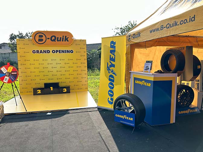 Mulai April 2024, produk Goodyear tersedia di seluruh cabang B-Quik. Goodyear akan bergabung dalam grand opening B-Quik Grand Wisata dari tanggal 26 hingga 28 April 2024. Sebagai toko atau bengkel berkonsep one stop shopping, B-Quik menyediakan layanan profesional dengan mekanik yang terlatih dan ahli yang akan memperkenalkan solusi pembelian ban Goodyear kepada konsumen dan memastikan konsumen memiliki akses ke produk ban berkualitas dengan mudah.