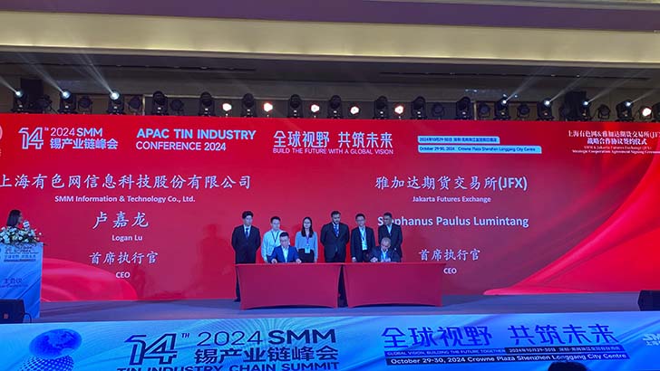 Shenzhen, China, Media-profesi.com – Pada acara APAC Tin Conference 2024 yang bergengsi yang diselenggarakan di Shenzhen, China, Jakarta Futures Exchange (JFX) dan SMM Information & Technology Co., Ltd (SMM), secara resmi telah menandatangani perjanjian terobosan untuk bersama-sama mengembangkan Indeks Harga Timah Asia.