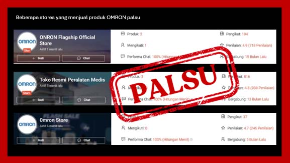 Toko online, situs web, dan akun media sosial yang ditemukan menjual produk palsu OMRON antara lain: