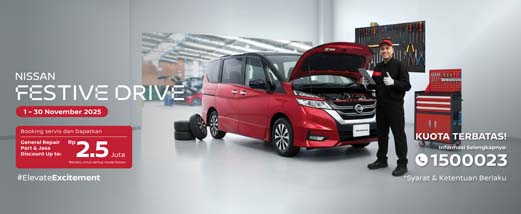 Untuk memastikan setiap perjalanan berjalan aman dan nyaman, Nissan Indonesia menghadirkan program spesial Nissan Festive Drive – November Deals. Melalui program ini, pelanggan dapat menikmati diskon General Repair Part dan Jasa hingga Rp2,5 juta, berlaku bagi 8.000 pelanggan pertama yang melakukan booking servis di bengkel resmi Nissan selama periode program berlangsung.