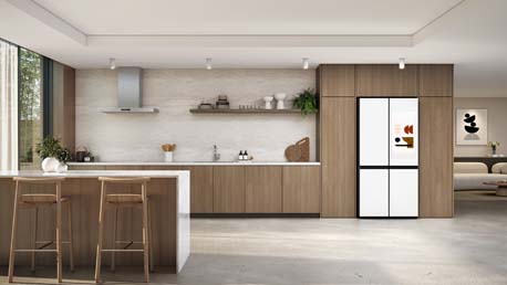 Bespoke AI 3-Door French Door Refrigerator terbaru hadir dengan desain zero clearance fit, yang memungkinkan pemasangan dengan jarak samping sekitar 4 mm. Selain itu, kedalaman pintu telah dikurangi hingga 50 mm dibandingkan model 3-Door konvensional, sehingga laci dan makanan tetap dapat diakses sepenuhnya saat pintu dibuka lebar, Fitur AutoView — pintu transparan — memudahkan pengguna untuk melihat isi kulkas tanpa perlu membukanya.